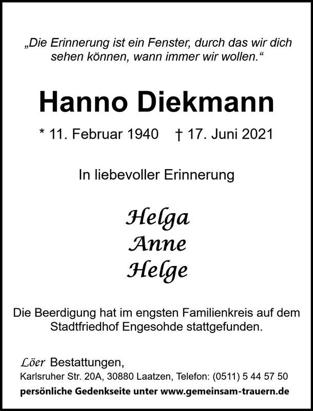 Mit Traurigkeit habe ich die Anzeige über den Tod von Hanno Diekmann gelesen.